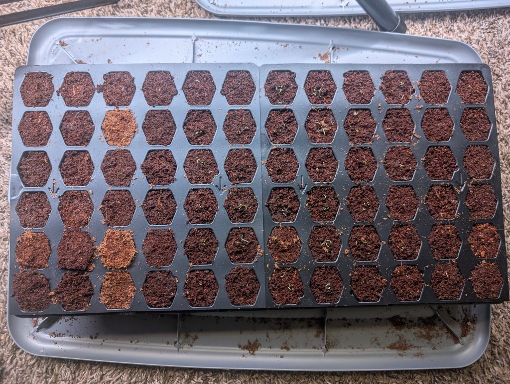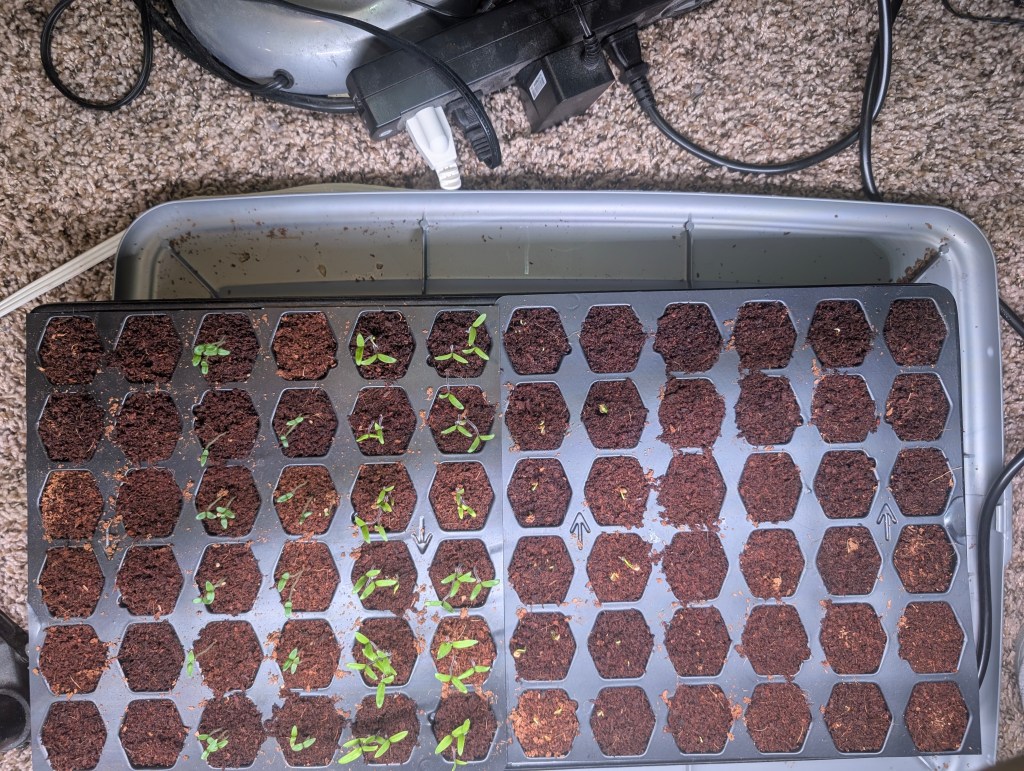 It has been a very cold week with some snow here in central Oklahoma. I had a tasty dinner for Valentine’s Day. The brownies turned out great. I also made some blueberry π« muffins for National Muffin Day. They were delicious but didn’t rise much on top. I used a recipe from the WinCo frozen blueberry package. I planted many seeds on Saturday, including: Anemone, Mexican hat, Goat’s beard, Motherwort, Elderberry black, Witch hazel, St John’s Wort, Datura, Orange milkweed, Common milkweed, Swiss Chard, Astragalus, Cilantro slow bolt, Oregano, Wild senna, Poppy pink and lavender, German chamomile, Showy milkweed, Valerian, Hollyhocks*2. I also planted two plants, an Angelina sedum and a purple poppy mallow. The wild ginger and hellebores haven’t been planted yet and aren’t looking good after the cold and snow. I think I should have brought them in but hopefully they will recover when the weather warms up. I plan to do some more planting this weekend once it is warmer but will have less time than last week. My indoor seed starting is going well so far. I am getting lots of germination of purple tomatillo and cherry tomato. Bunching onions have also germinated well. I also planted marjoram and thyme. They are just starting to come up. I have a few peppers starting to pop up. The large Walter tomatoes haven’t germinated yet. I am using a heat mat for one tray and no heat mat for the other. The one with the heat mat is showing better germination rates so I guess it is worth using. I finally used up the last of our sweet potato harvest this week. I made some yummy mashed sweet potatoes with sage and white pepper. One of the last sweet potatoes had begun to sprout so I put it in a bag with some dirt under the grow light. I put some small holes in the bag for drainage.I really enjoyed digging up all those sweet potatoes last year and hope to do it again this year. If this bag method seems effective, I may try to start some other seeds in bags next week. The weather seems to be warm next week and I hope it means winter is done. We have ordered two pawpaw trees and they will arrive in the next week or two. We have gotten a lot of compost and other things to amend the clay soil for the tree area. I have not been able to work on the trellises due to the cold weather but I have been researching the best designs for different types of plants. I am learning that the weather in Oklahoma is more unpredictable than Texas due to the strong winds. I will need to make sturdy trellises that can handle the winds here. We’re also continuing to expand the drip line irrigation area. I hope to plant another two packets of wildflowers this week along with some cold hardy greens like kale and spinach. I am going to plant lots of chives and bunching onions around the greens to hopefully repel the grasshoppers. I am very happy to have so many seeds and am excited to see this year’s result. So patiently waiting for spring.