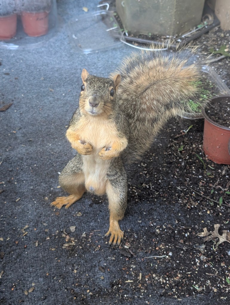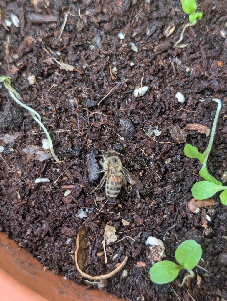 It was another rainy week here in central Oklahoma. There’s more rain in the forecast for the next two weeks as well. It is June now and usually it would be much warmer by now than it is. Due to all of the rain, it has stayed cool. We had a big storm with hail one day that knocked over my biggest sunflower on the balcony. I have since tried to straighten it back out but it isn’t cooperating. It has become floppy. I have some time off on the weekend and we plan to go to the farm on Saturday. There’s a high chance of rain that day but we need to check on the cat so we’ll be going rain or shine. Hopefully, the sun will shine so I can do some more planting. I got a new plant this week to put by the pawpaw trees that is called a beautyberry. It is supposed to attract 40 species of birds. It has pretty purple berries that you can eat in jams and jellies but don’t taste good fresh. I will be taking the other seedlings from the balcony to the farm to plant if the weather permits. My chamomile on the balcony has been blooming despite the rain and I have been collecting the flowers for tea. I have also started hanging some peppermint to dry for tea. I think the fresh peppermint leaves make a weaker tea than the dried. Unfortunately, the camellia sinensis tea plants I planted at the farm are doing poorly. However, the fig trees that we had thought dead have begun to regrow. I have done some more drawings for my family this week and practiced drawing the knee in my class. I took a very cute squirrel photo this week. I also saw my thirsty bee friend again this week, sipping water from the soil.