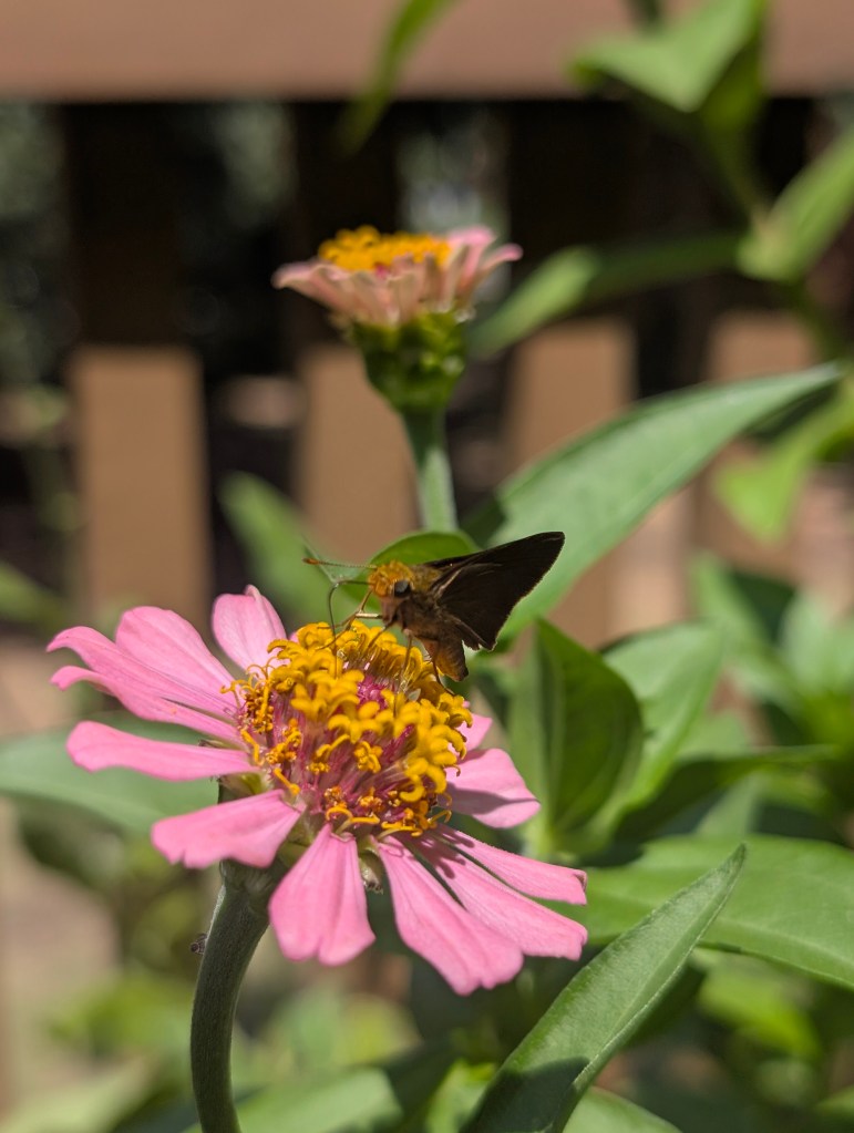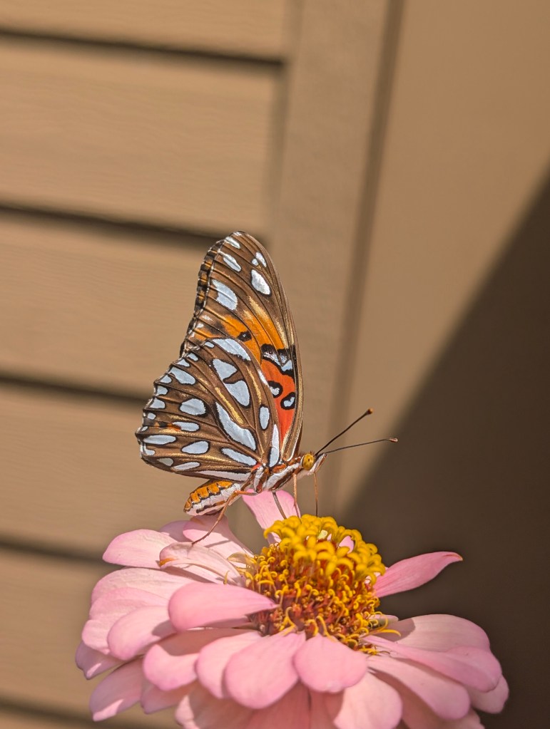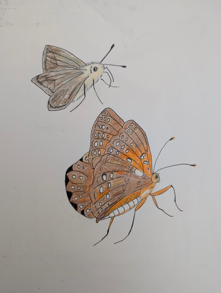 It rained a bit earlier this week and we had a brief power outage. It is supposed to rain again for the next four days and the temperature is expected to drop a lot in central Oklahoma. I didn’t visit the farm last weekend but I am planning to go this Saturday and the following Saturday. I have started a few seeds indoors for fall last week including red yucca, common milkweed, showy milkweed, nicotiana, marigolds, black eyed Susans, blanket flower 2 types, fanfare and Arizona sun, Texas star hibiscus, confederate rose, California poppies, dianthus. The nicotiana and marigolds were self harvested. So far the showy milkweed, marigolds, fanfare blanket flower, and red yucca have not sprouted. I have found milkweed to be a bit hard to start in the past. The common milkweed sprouted but died shortly after from damping off. It will be awhile before these seedlings are ready to be transplanted. I have not been able to keep seedlings outside recently because something is munching on them at night. The new hydrangea has been affected by some type of leaf spot. I tried to pull off the infected leaves but it is continuing to spread. The marigolds, zinnias, and, nicotiana are still blooming. The vitex are growing rapidly. Next weekend, I will plant the two vitex, the hydrangea, and the whorled milkweed. My first bell pepper was burnt by the sun but the plant has another pepper growing. One of my pepper plants is flowering but the other isn’t. I saw more butterflies on the zinnias this week. I saw another beautiful gulf fritillary, a skipper, and a hackberry emperor missing a large piece of one wing. I made a butternut squash soup yesterday with pears and dark chocolate. It tasted pretty good but the color was unappealing. I started reading a book about painting still life and flowers. I am enjoying it so far. I drew another butterfly this week from a library book. I went to the Asian grocery store in my city and they sell plants in front of it. I bought an aloe vera plant for only 7 dollars. I am excited because aloe really helps with my lupus skin rashes. I think I need to move it inside before it rains because it likes a dry environment. It is not perennial here so I will have to move it indoors in winter. After I plant the vitex, I will transfer the aloe into that larger pot. I am looking forward to the cooler weather this week and I can’t wait to see my cat again this weekend. My boyfriend went to check on her earlier in the week and he discovered that she has a new cat friend to hang out with. It was scared of my boyfriend and ran away. This week, I will prepare my entries for the county fair. I hope I will be able to get everything ready in time to enter. I will be making the fideo soup this week and continuing to draw butterflies for awhile.