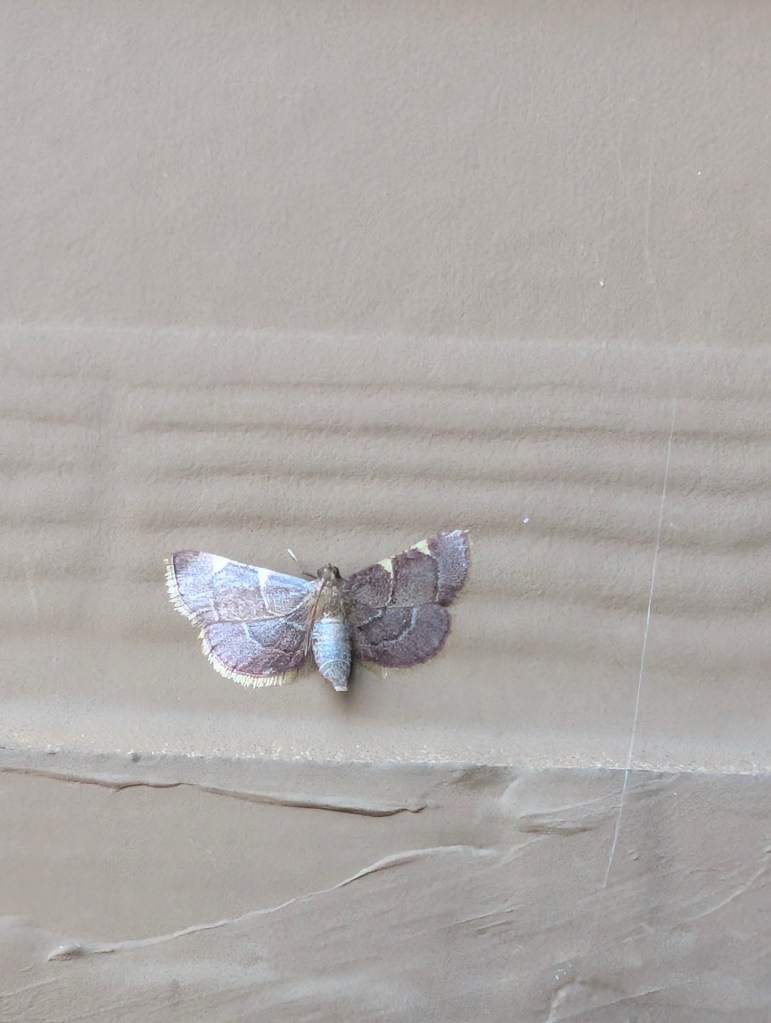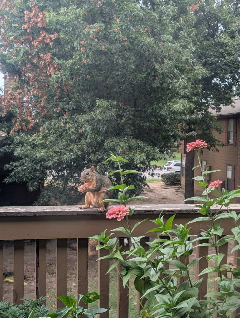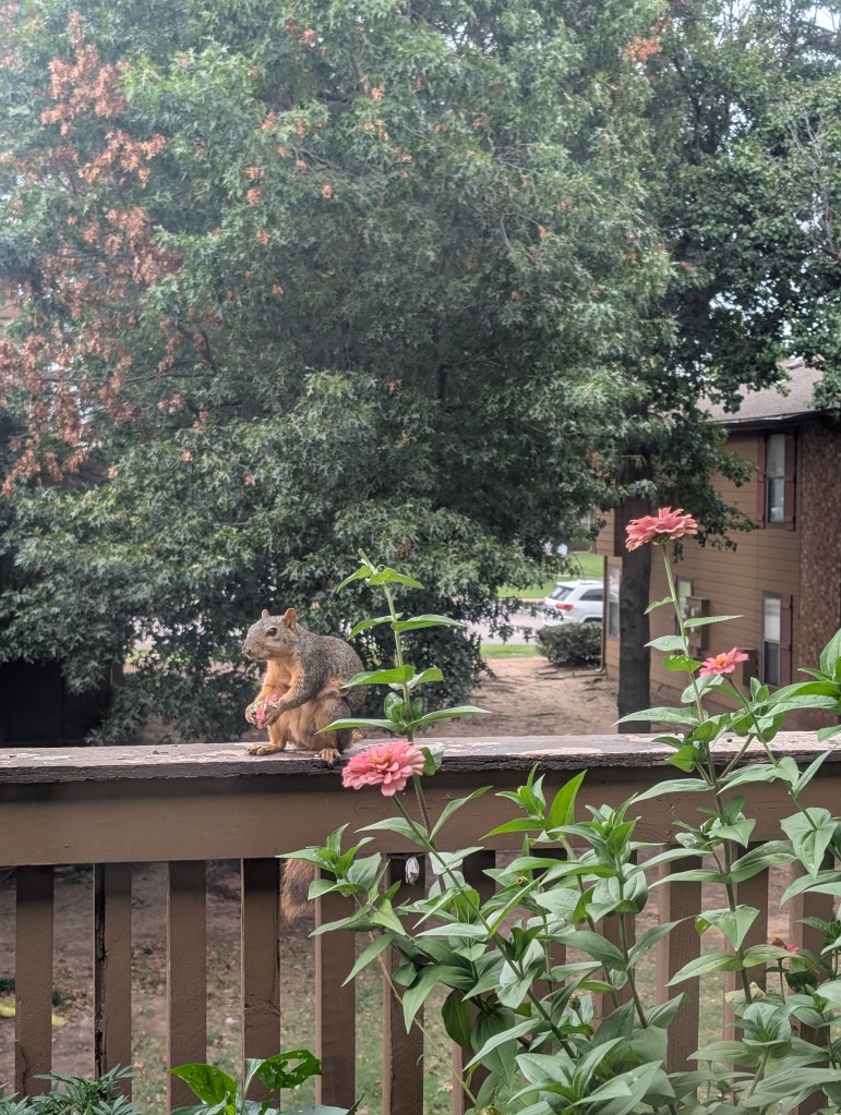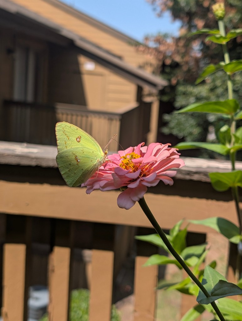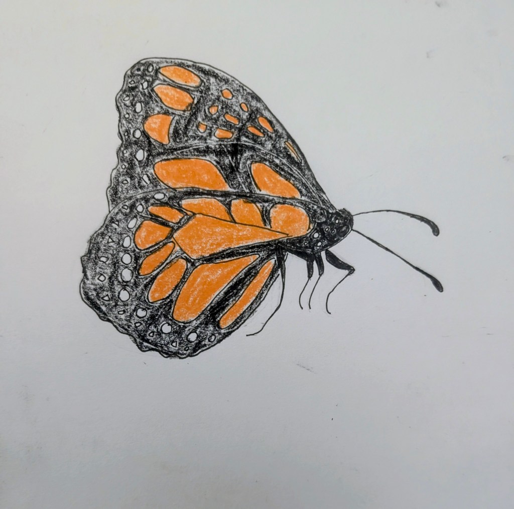 This week was warm and humid in central Oklahoma but it didn’t rain. I didn’t go out to the farm this week but I was still able to see a few butterflies at my apartment. The zinnias on my balcony are continuing to bloom. I saw a new butterfly this week on them, a cloudless sulphur. It was such a pretty chartreuse color. I also saw a yellow fringed dolichomia on the wall. Love the contrasting yellow and purple colors of this one. The nicotiana is also still blooming. The peanuts are blooming again and I have one forget me not blooming this week on the balcony. The ginger has finally gotten a leaf. The aloe vera seems to be doing ok . The scarlet runner bean has gotten its first flower but something is eating holes in the leaves. It has really grown a lot since the temperature has dropped a bit. The radishes are doing well and so are the two peppers. The marigolds don’t seem to be blooming much lately. We have bought two new trees for the farm this week and I hope they do well. We got an ambassador walnut tree as well as a combination pear tree that is supposed to have four types of pears grafted on to it. The walnut tree has a green walnut on it but the leaves are a bit spotty. I learned that walnut trees have a substance called juglone that they emit that can be harmful to other plants. Some plants can tolerate this substance but others can’t. We will have to put it far from plants that are affected by the juglone. My seedlings are doing well and I separated them and transplanted them into larger containers. We will probably plant them the next time we visit the farm so they can establish roots before it freezes. I also learned this week that some squirrels like to eat zinnias. One of my zinnias grew too close to the rail and one of the squirrels seized the opportunity to snatch it up. The squirrel seemed to really enjoy eating the zinnia. My sister sent me a picture of some lacewing eggs she saw and they are pretty cool looking. I made some basil walnut pesto and it turned out pretty good. The basil plant is recovering well from such a big cut. I made balsamic herb chicken and it was also tasty. I haven’t read much this week because it was a busy week at work again. I think next week will be busy as well so I don’t think we will go to the farm next week. I have been continuing to work on drawing butterflies and this week I tried to draw a monarch. Next week, I will try to draw the cloudless sulphur.