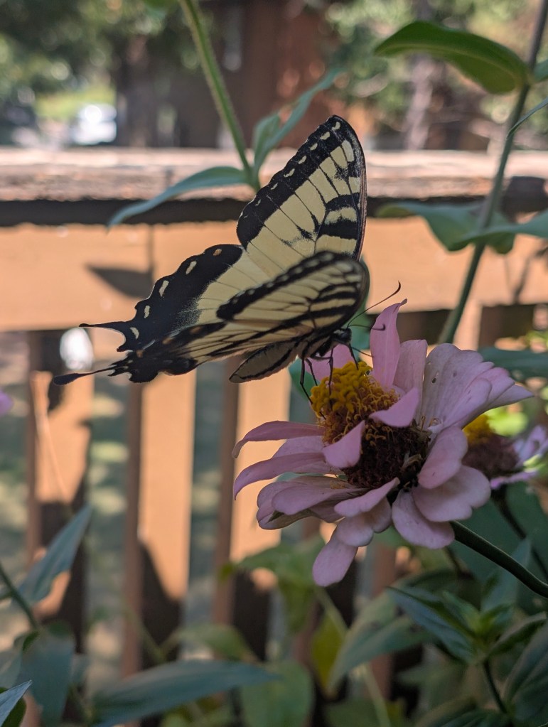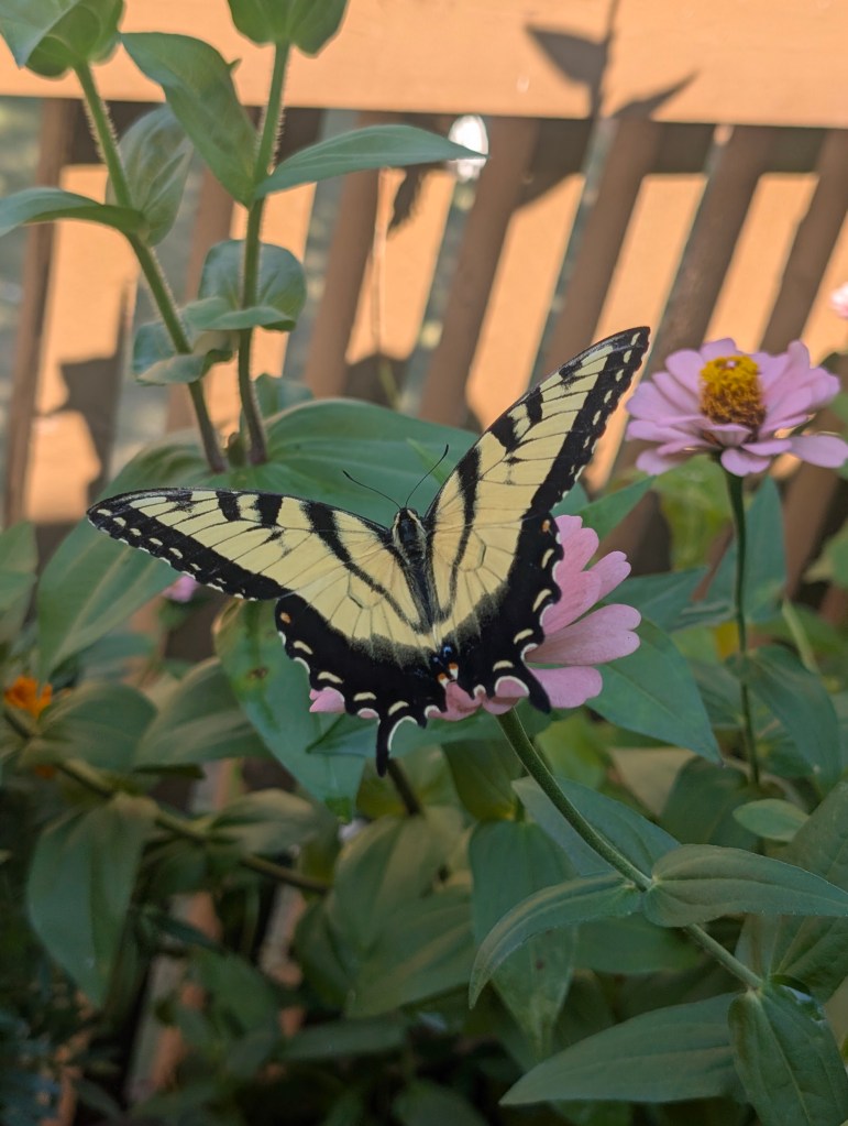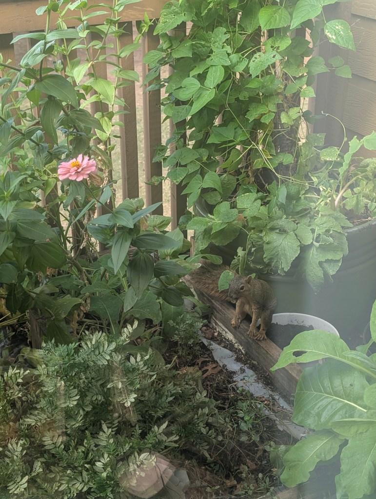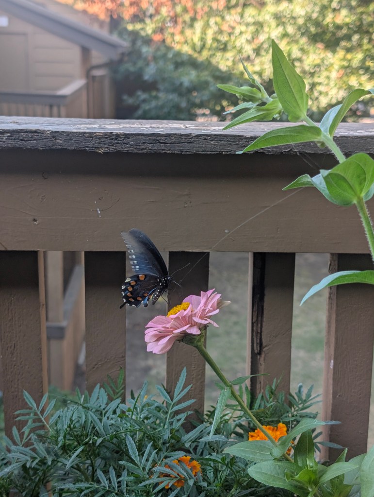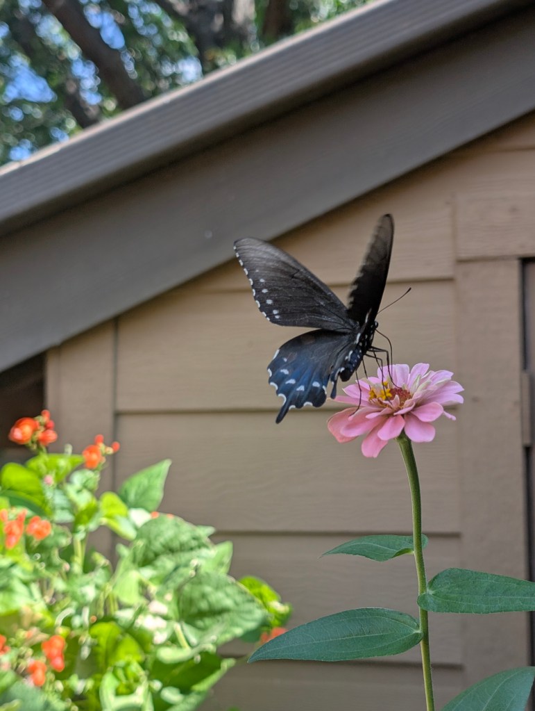 It has been a very hot start to October for us here in central Oklahoma. It has been dry all week as well. I didn’t go to the farm this week as I had a busy week at work. My balcony garden is still doing ok, although the nicotiana has stopped blooming. There are still a few marigolds and the zinnias are continuing to have lots of blooms. There is some powdery mildew on some of my plants. The scarlet runner beans are still blooming but I have not seen any beans yet. I would like to save a few of those beans to plant for next year. The squirrels sometimes try to eat the runner bean plant and the zinnias. They have been bringing lots of acorns to my balcony to bury in my pots and raised beds. They keep digging up my ginger sprout and I have replanted it a few times. Those guys are cute though, so I’ll allow it. I saw my favorite squirrel this week and I am always happy to see him. I saw some familiar butterflies on my balcony this week. I saw a gulf fritillary and an eastern tiger swallowtail and got some nice pictures. I also saw the pipevine swallowtail return. I saw a monarch this week but it flew away before I got a photo. I also saw some sachem on the zinnias this week including two that were sharing a flower, a real zinnia party. I didn’t see any new butterflies this week. I bought another coral bells at the local nursery since they are still on sale for seven dollars. This one is called “Fire Chief”. The other one I forgot to plant last week is called “Obsidian”. I moved all of my seedlings outside to prepare them to be transplanted the next time we visit the farm. I think the amount of sunlight on my balcony is changing with the seasons. It is not getting as much sun as it did earlier in the year. I cooked some baked barbecue ribs and my boyfriend finally tasted the kimchi I made for him. He liked it but said it was a little too fishy tasting. I think I would reduce the amount of fish sauce and salted shrimp if I made it again. I had Friday off and spent the day cleaning and drawing. I started to read a new book about pen and ink drawing techniques this week. I did a cat drawing for my mom but I haven’t had time to work on her Michael Jackson drawing yet. I plan to start on it soon. I have the next three days off due to the Korean and Chinese holidays. I am looking forward to sleeping in a lot. π€