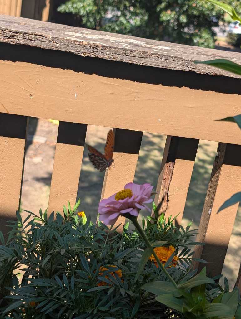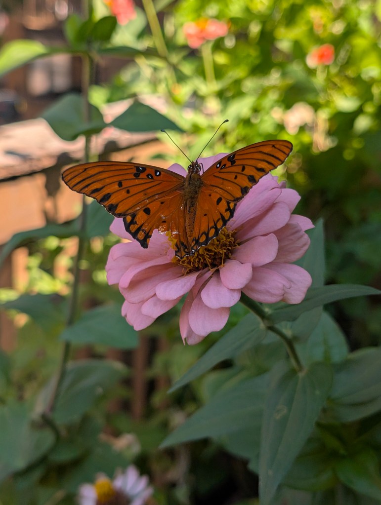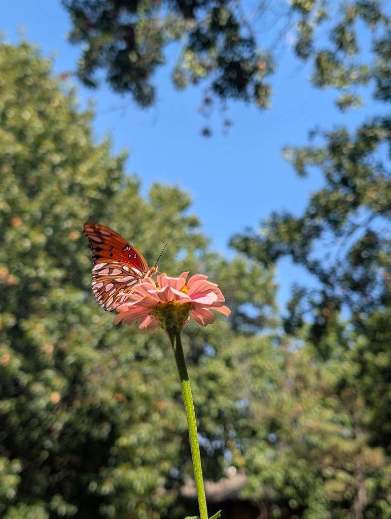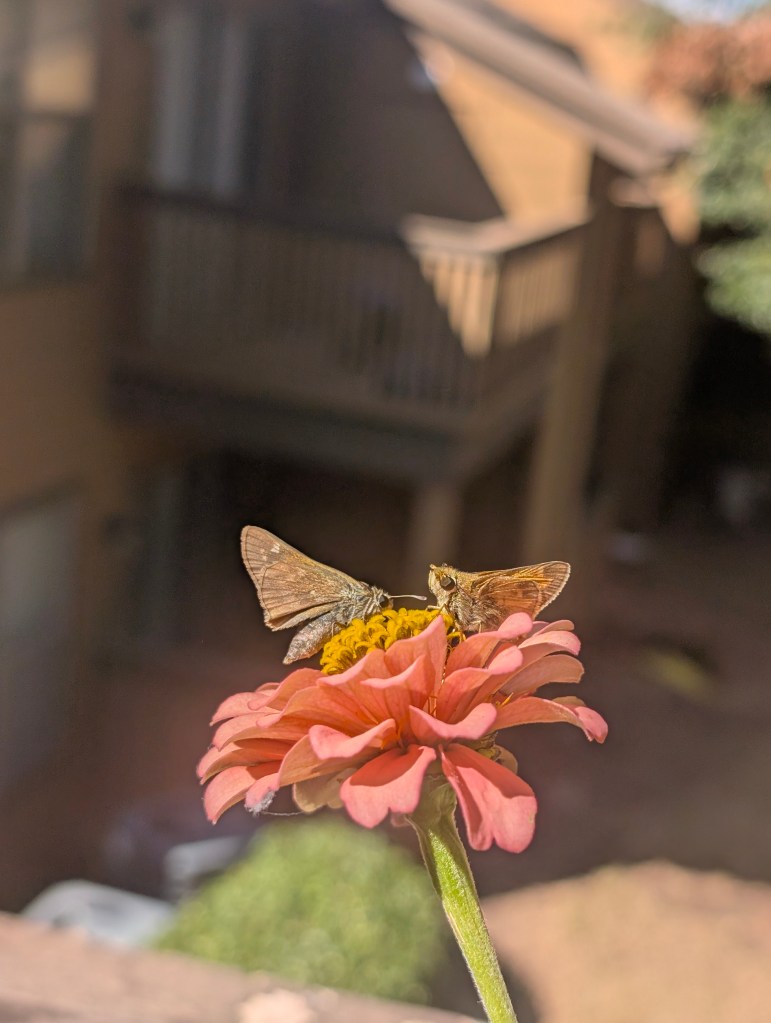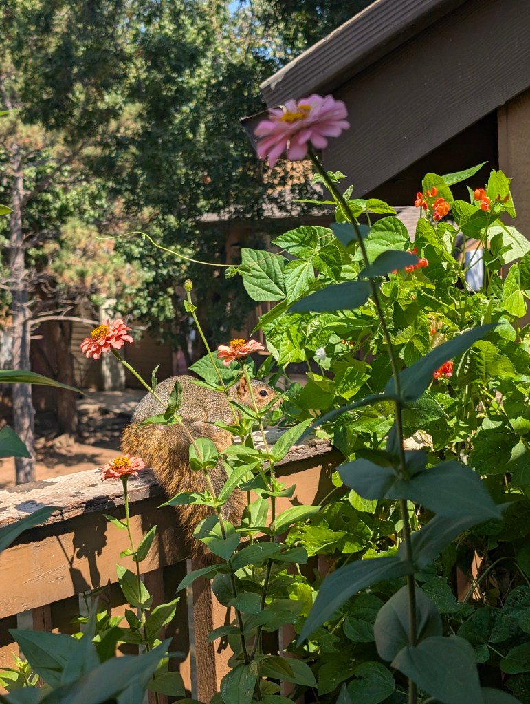 It has been a very hot start to October for us here in central Oklahoma. It has been dry all week as well. I didn’t go to the farm this week as I had a busy week at work. My balcony garden is still doing ok, although the nicotiana has stopped blooming. There are still a few marigolds and the zinnias are continuing to have lots of blooms. There is some powdery mildew on some of my plants. The scarlet runner beans are still blooming but I have not seen any beans yet. I would like to save a few of those beans to plant for next year. The squirrels sometimes try to eat the runner bean plant and the zinnias. They have been bringing lots of acorns to my balcony to bury in my pots and raised beds. They keep digging up my ginger sprout and I have replanted it a few times. Those guys are cute though, so I’ll allow it. I saw my favorite squirrel this week and I am always happy to see him. I saw some familiar butterflies on my balcony this week. I saw a gulf fritillary and an eastern tiger swallowtail and got some nice pictures. I also saw the pipevine swallowtail return. I saw a monarch this week but it flew away before I got a photo. I also saw some sachem on the zinnias this week including two that were sharing a flower, a real zinnia party. I didn’t see any new butterflies this week. I bought another coral bells at the local nursery since they are still on sale for seven dollars. This one is called “Fire Chief”. The other one I forgot to plant last week is called “Obsidian”. I moved all of my seedlings outside to prepare them to be transplanted the next time we visit the farm. I think the amount of sunlight on my balcony is changing with the seasons. It is not getting as much sun as it did earlier in the year. I cooked some baked barbecue ribs and my boyfriend finally tasted the kimchi I made for him. He liked it but said it was a little too fishy tasting. I think I would reduce the amount of fish sauce and salted shrimp if I made it again. I had Friday off and spent the day cleaning and drawing. I started to read a new book about pen and ink drawing techniques this week. I did a cat drawing for my mom but I haven’t had time to work on her Michael Jackson drawing yet. I plan to start on it soon. I have the next three days off due to the Korean and Chinese holidays. I am looking forward to sleeping in a lot. π€
