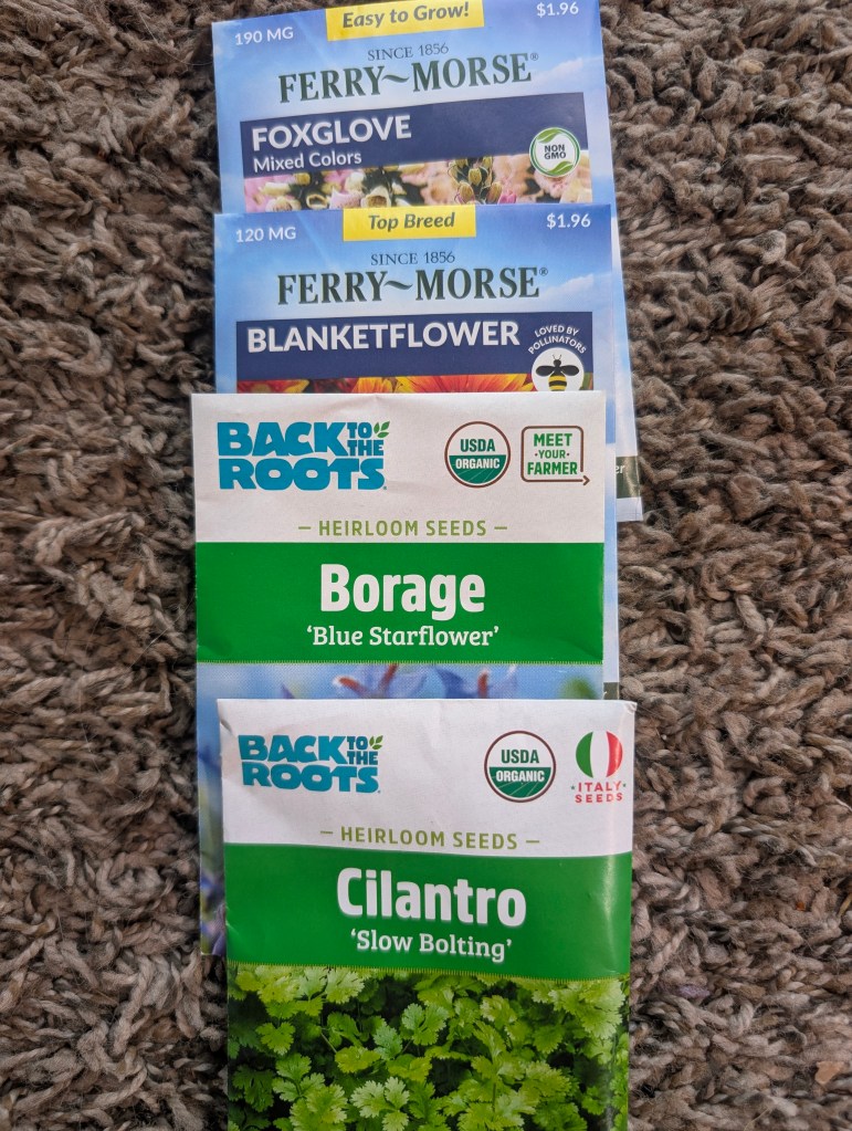 It was a very warm week in central Oklahoma until today. We broke some high temperature records this week but the cold winds returned today. I’m so excited to see the stores already putting the seeds out. I bought a few packs from Walmart and Dollar Tree. Dollar Tree has increased the price of the seeds again this year from 4/$1.25 to 3/$1.50. I had great luck with the Dollar Tree seeds last year and they are still more affordable than other options. I will probably order more seeds online next week that I can’t get locally. I am going to order from Free Heirloom Seeds because I also had good results with their seeds last year. I am also considering ordering some seeds from a company called Fellabees that seems to have good prices. It is a good idea to start early with some plants so I am already thinking about my plan for the spring garden. My boyfriend gave me some sunflower seeds and some wildflower seeds this week. He also gave me a large set of Marie’s hot wing sauces because I love spicy chicken. I bought a bunch of chicken wings and tried out the different flavors. The sauces were pretty good although they were not super spicy. The ghost pepper hot sauce and the Japanese barbecue sauce were my favorites. The garlic parmesan flavor did not taste like garlic or parmesan, in my opinion. I went to my local Vietnamese market to buy some banh mi and I also checked out the fruits. I saw something I haven’t tried, cherimoya. I hope to try it in the future although I am waiting to see if the price goes down. They are fourteen dollars a pound, quite high for fruit. They had some cute dishes and silverware for a low price. On the way home, I saw some pretty pansies and a tree growing in another tree. I also saw a very nice deodar cedar with gold coloring. I would like to get one of those for the farm in the future. I saw more great tailed grackles this week. I have been a little obsessed with them lately and really want to draw one soon. I did go to the farm tonight to feed the cat and the opossum. Both are doing well. It was dark and very cold outside so I didn’t get get good photos of either of them. I did some drawing this week and started a sketch of the book my sister gave me. I think it needs more work before I color it. My friend really liked the miniatures I painted for him and is going to mail me some more to paint soon. The new year is coming and I have a day off. I’m going to make black eyed peas on New Year’s Day. I got a good deal on some fresh ones this week. Happy New Year’s 2026!